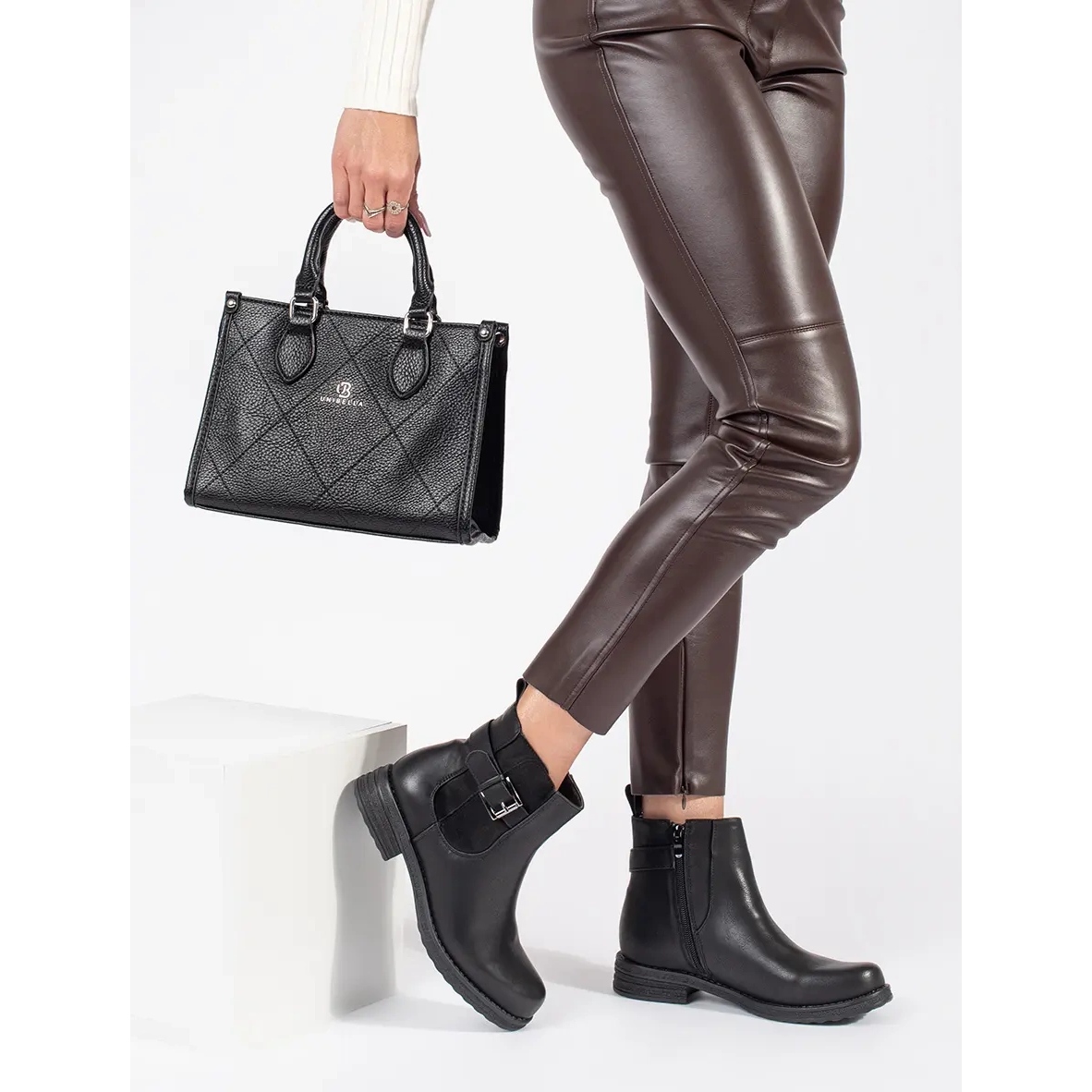 Svarta kvinnors stövlar med ett lågt avhöjt spänne från tillverkaren Ett annat märke är det perfekta valet för varje fashionabla kvinna som letar efter universella och bekväma skor varje dag. Tillverkade av högkvalitativt ekologiskt läder, dessa stövlar glädjer med en enkel och elegant design.