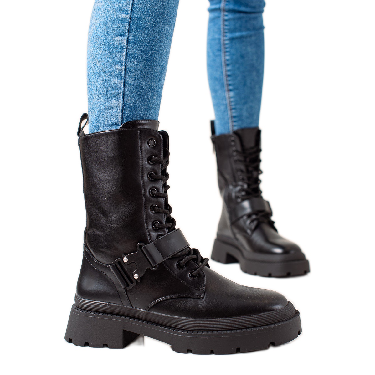 Dessa höga stövlar är gjorda av ekologiskt läder, vilket gör dem inte bara estetiska, utan också miljövänliga. Den svarta finishen tillför elegans och det dekorativa spännet framhäver deras unika karaktär. Interiören är fodrad med textilmaterial vilket gör den behaglig att ha på sig hela dagen och vinterisoleringen håller dina fötter varma även under de kallaste dagarna.