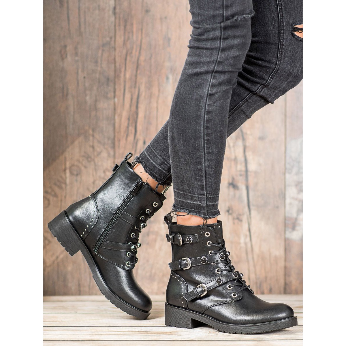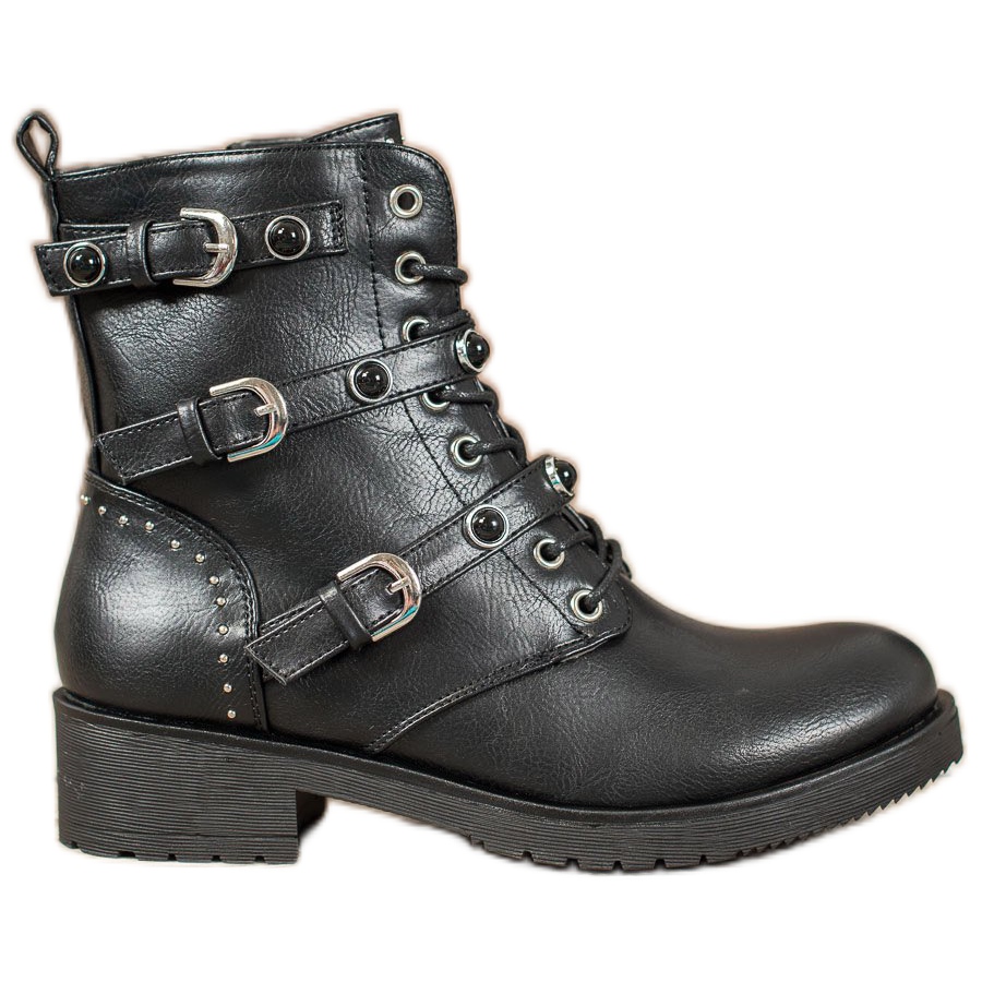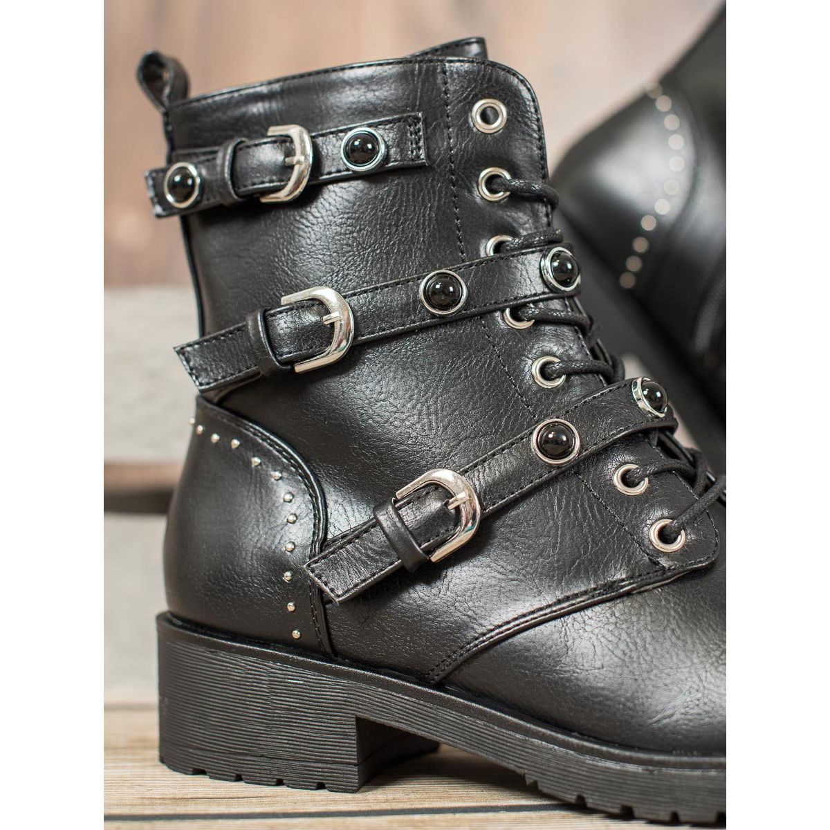 Dessa unika stövlar har snörning framtill och dragkedjor på insidan, vilket gör dem lätta att ta av och på. Dessutom ger dekorativa bälten med spännen och strass en rockkaraktär till dem, vilket gör dem till en fashionabel accent för alla stylingar.