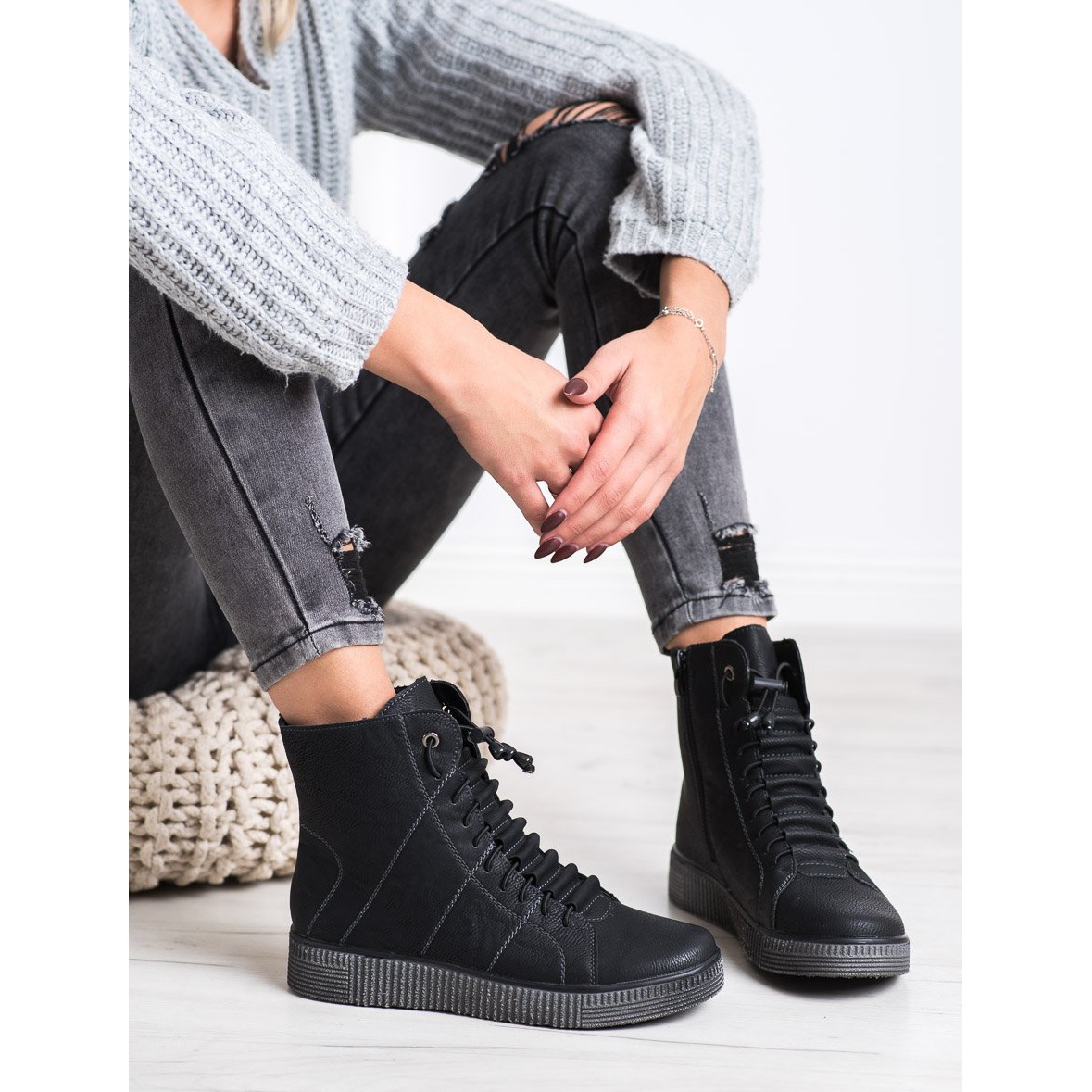 Svarta plattformsarbetare från SHELOVET är ett förslag som kombinerar mode med funktionalitet. Oavsett tillfälle kommer dessa ankelboots att vara det perfekta komplementet till vilken styling som helst – både för vardagsbruk och för kvällsutflykter.