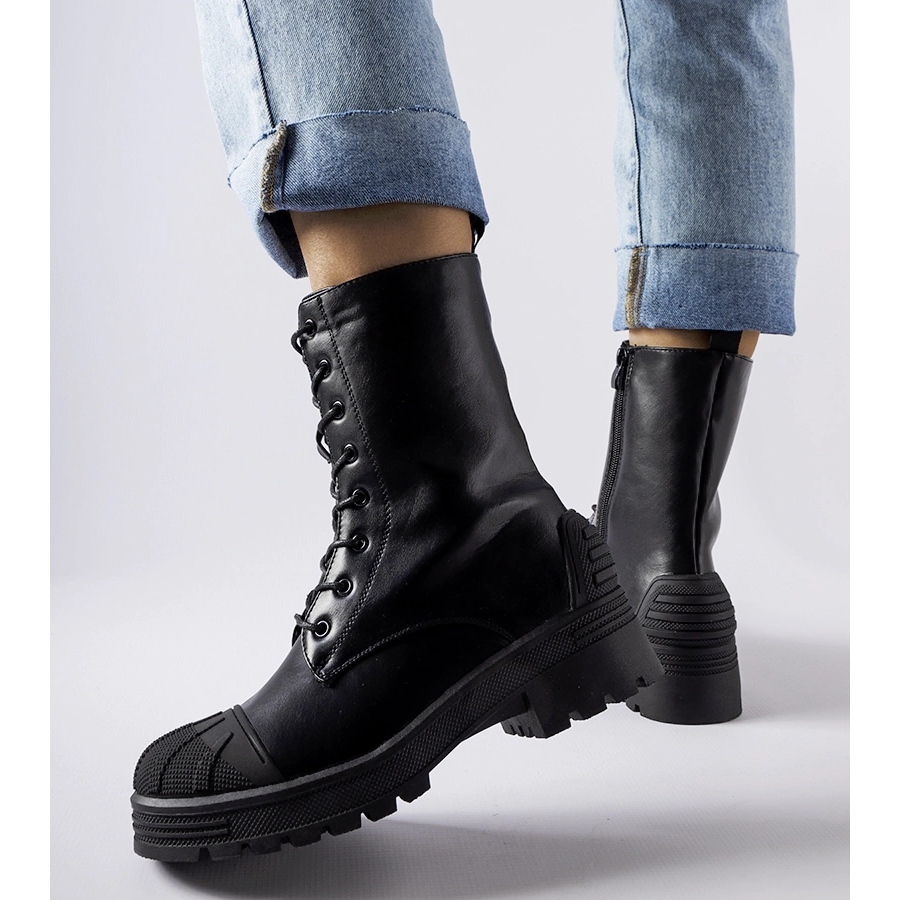 Manara -svarta arbetare är isolerade, ögonfångande kvinnors stövlar med en modernistisk karaktär. Tillverkad av ekologiskt läder, utrustat med snörning och blixtlås - perfekt för höstens säsong.