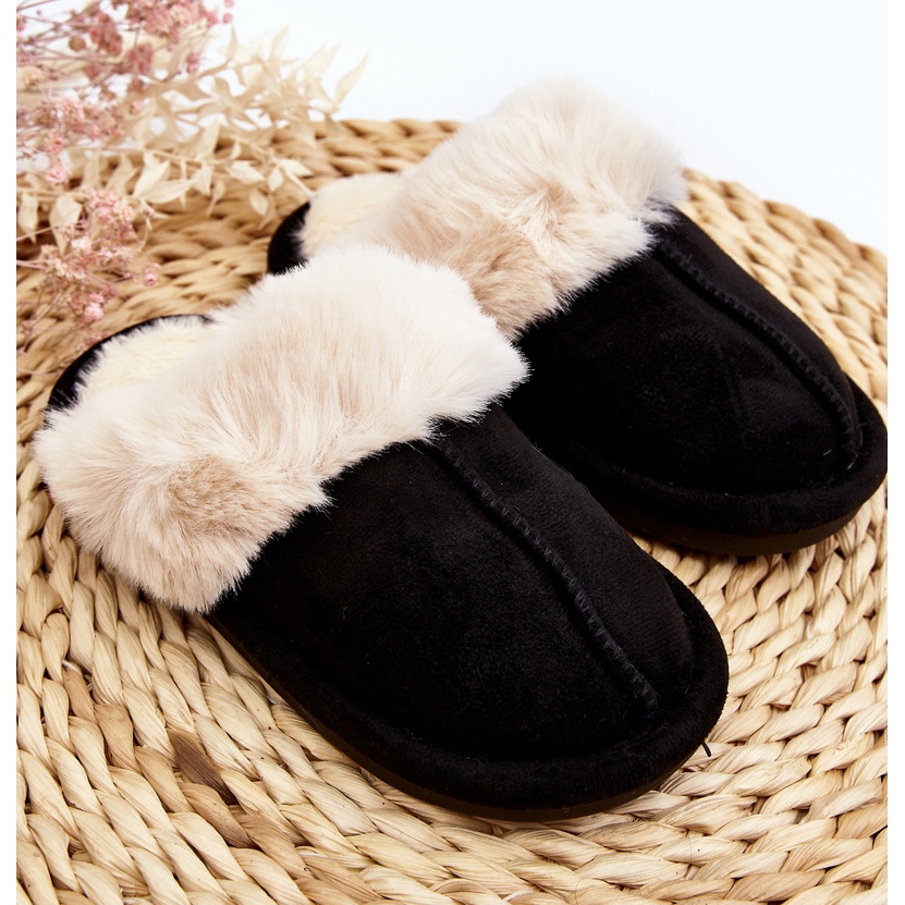 Delikat till beröring av barnens tofflor gjorda av ekologiskt mocka läder. Perfekt för svalare dagar - interiören isolerad med mjuk päls ger värme och komfort, och de täckta näsorna skyddar dessutom småbarns fingrar. En gummipastsula med en höjd av ca. 2 cm isolerar från en kall mark och garanterar stabil vandring hemma. Slidda, universell modell (unisex), tillgänglig i svart.