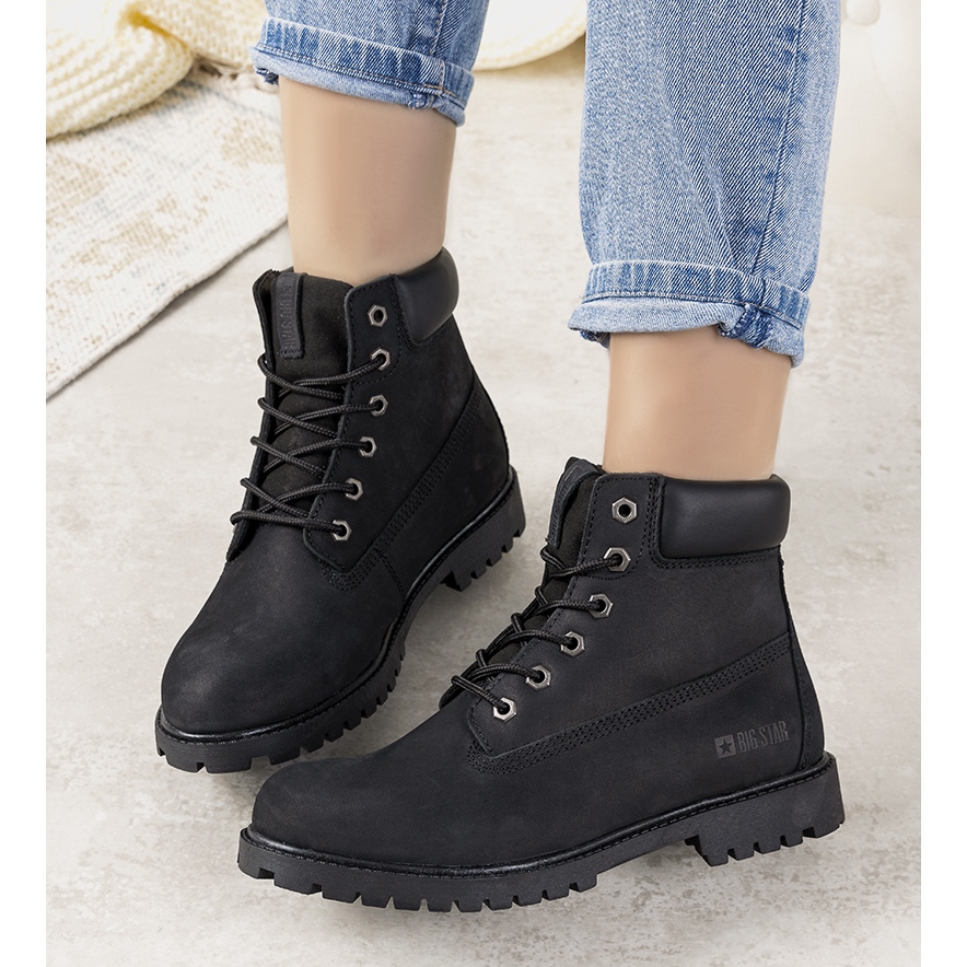 Ovandelen på kängorna är gjord av nubuck, som är ett naturligt läder som är motståndskraftigt mot ogynnsamma väderförhållanden. Tack vare korrekt impregnering kommer de att fungera utmärkt under regn och kallare dagar, vilket garanterar komfort och skydd för dina fötter. Denna modell är utrustad med bekväm snörning, vilket gör att skorna passar perfekt till benet.