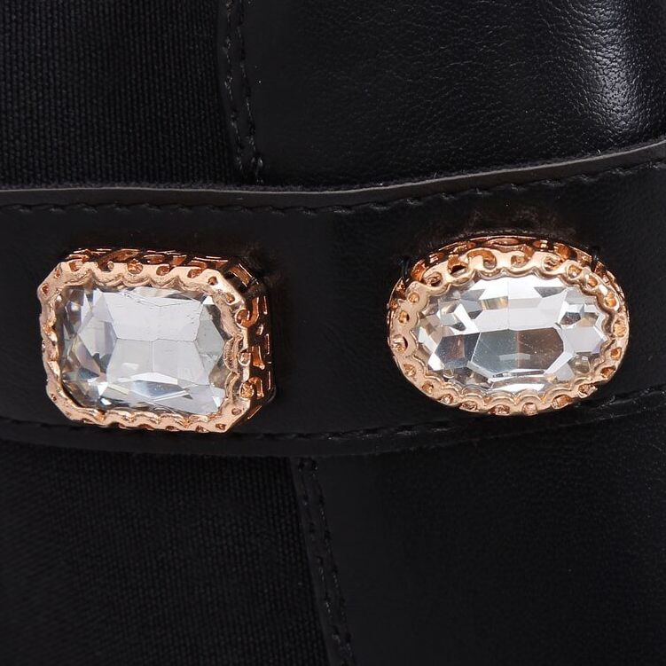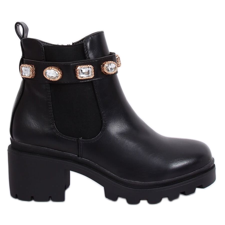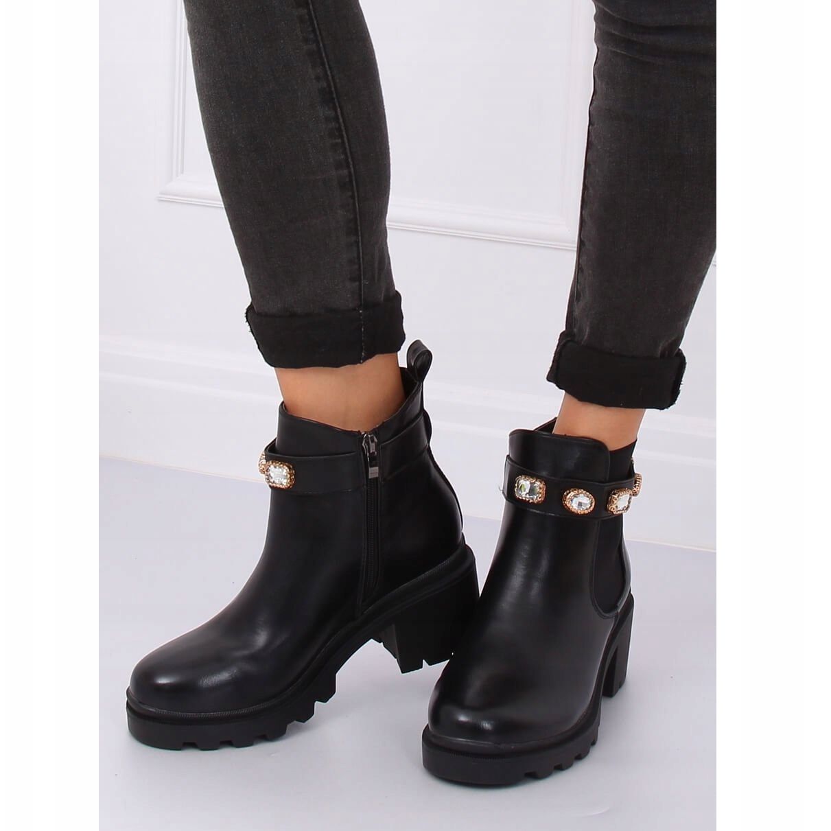 Denna modell kännetecknas av imponerande strass i en guldram, som ger den en unik karaktär och får varje styling att glänsa. Det elastiska inlägget på sidan och dragkedjan är praktiska lösningar som gör det enklare att ta på sig skorna samtidigt som de säkerställer en perfekt passform.
