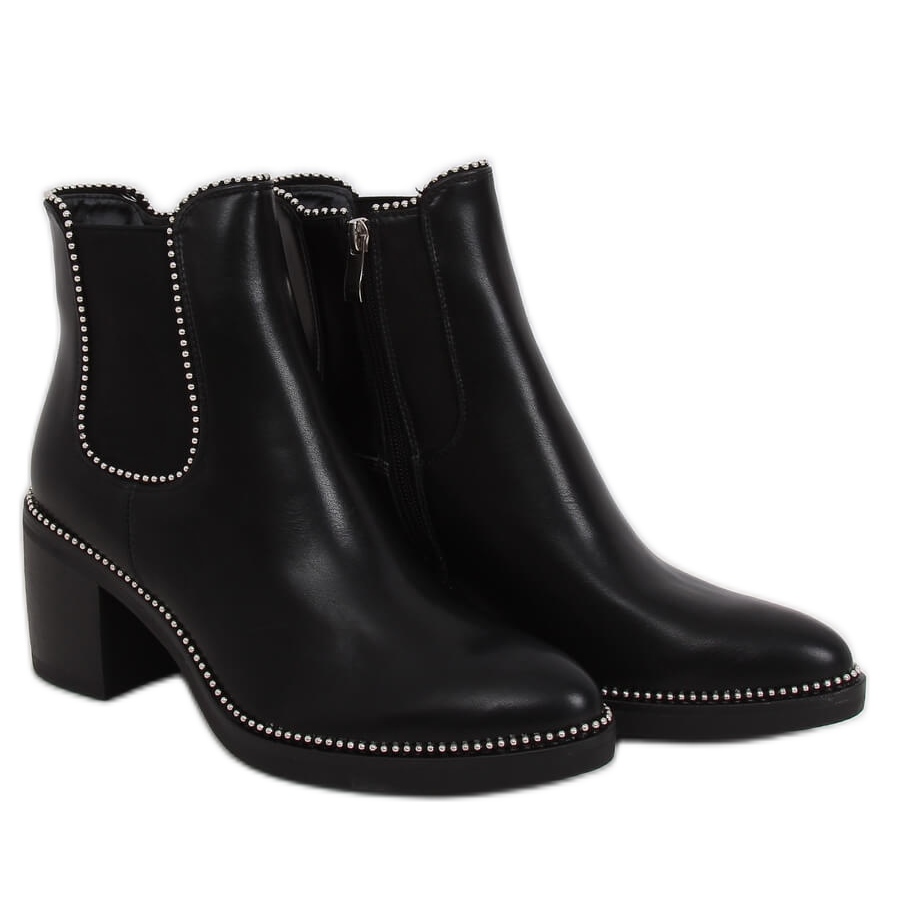 Dessa iögonfallande ankelboots har en klassisk svart färg som passar perfekt till en mängd olika outfits – från vardagliga till mer eleganta. En ytterligare fördel är moderna detaljer i form av silverkulor, som subtilt dekorerar området runt gummiinläggen och sulan, vilket ger skorna en unik karaktär.