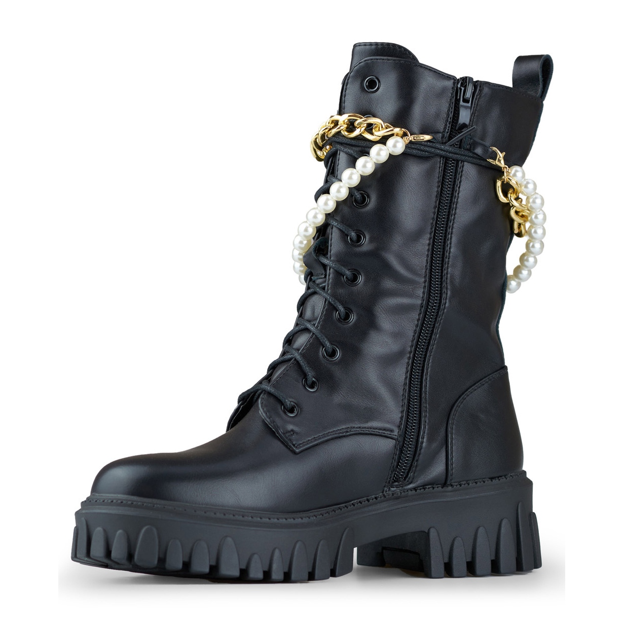 Moderna, tidlösa svarta arbetare tillverkade av ekologiskt läder. Kombinationen av bergkaraktär (strass, kedja) med praktiska lösningar - slottet och snörningen säkerställer snabb att sätta på och perfekt passform, och den avtagbara dekorationen ger möjlighet att snabbt ändra utseendet. Den isolerade interiören får skorna att fungera under hösten/vintersäsongen.