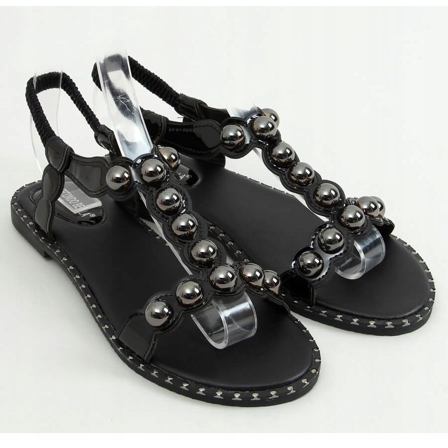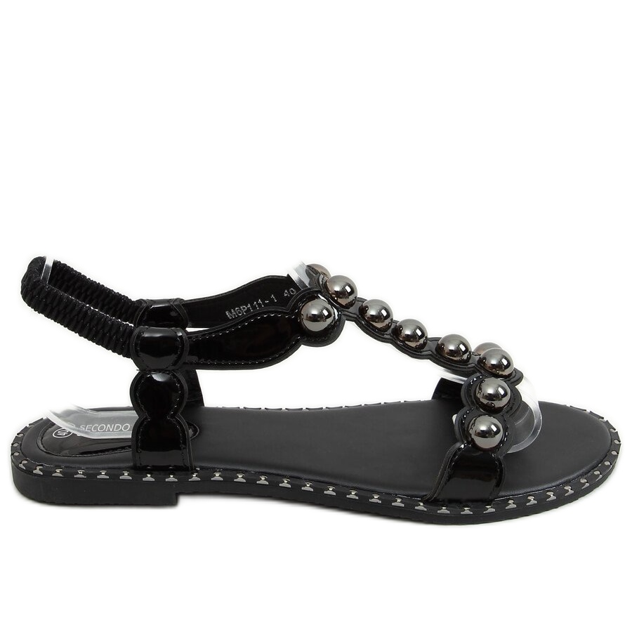 Upptäck elegans och komfort med svarta damsandaler M6P111-1 Svart! Dessa unika platta sandaler är en perfekt kombination av stil och komfort som kommer att fungera bra med alla vardagsstilar. Deras extravaganta design med en lackerad finish och glänsande bollar väcker uppmärksamhet, och du kommer definitivt att göra ett fantastiskt intryck vart du än går.
