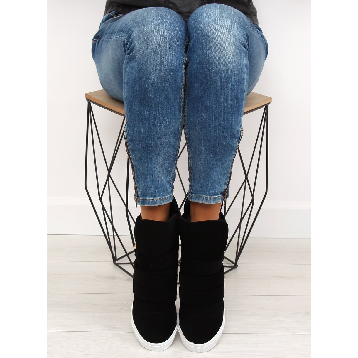 Svarta sneakers H6507 svarta för kvinnor är det perfekta valet för kvinnor som värdesätter en kombination av komfort och stil. Dessa moderna skor med en 7 cm hög dold kil framhäver din figur perfekt och gör den mer attraktiv. Ovandelen dekorerad med breda ränder med en elegant gulddekor introducerar en touch av lyx, och den kontrasterande vita sulan ger en sportig karaktär.