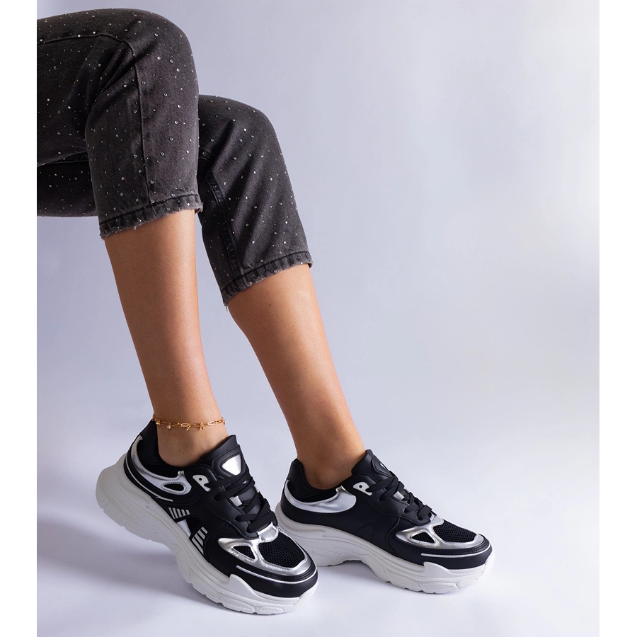 Svarta kvinnors sneakers med silverinsatser är ett bra val för varje modern kvinna som vill kombinera stil med komfort. Dessa eleganta sportskor, märkta med A88-181-modellen, kombinerar hög kvalitet, modern design och funktionalitet.