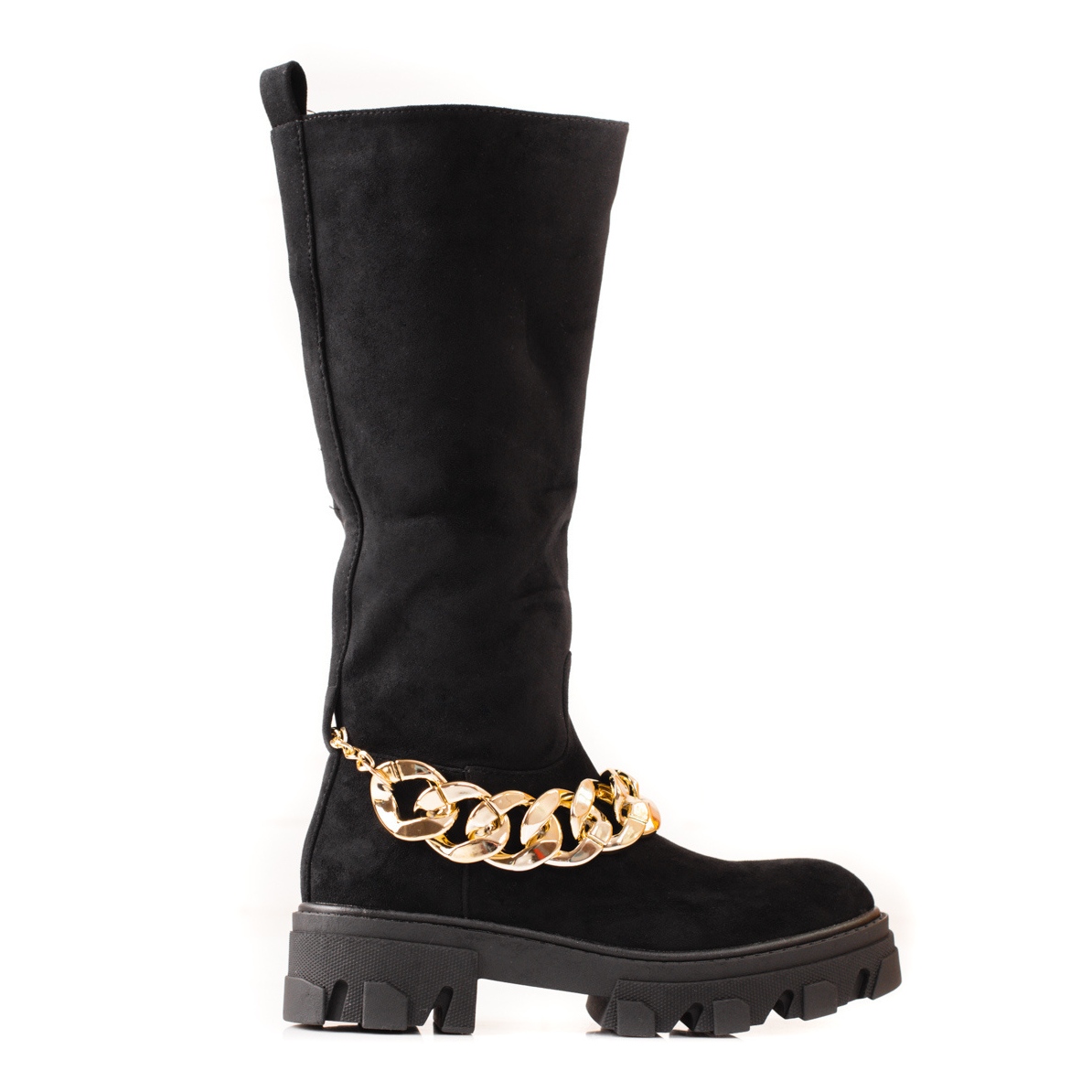 Kvinnors svarta stövlar med en gyllene kedja - en klassiker med en fashionabla accent. Eleganta, universella stövlar från ett annat märke, perfekta dagligen och för mer formella stiliseringar. Tillverkad av svart mocka eko -läder, dekorerad med en subtil gyllene kedja, som lägger till karaktär, utan att förlora det tidlösa utseendet.