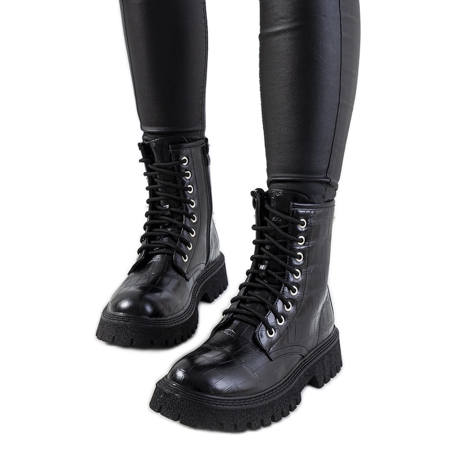 Svarta kvinnors stövlar med Eco-läder bundna är det perfekta valet för hösten, som kombinerar fashionabla stil och funktionalitet. Inspirationen för att skapa denna modell var de ikoniska stövlarna, som ger skor trender en original karaktär. Stövlar är gjorda av högkvalitativa organiska läder, stövlar med en känslig krokodilstruktur, vilket gör att de blir ett verkligt element av mode i varje stilisering.