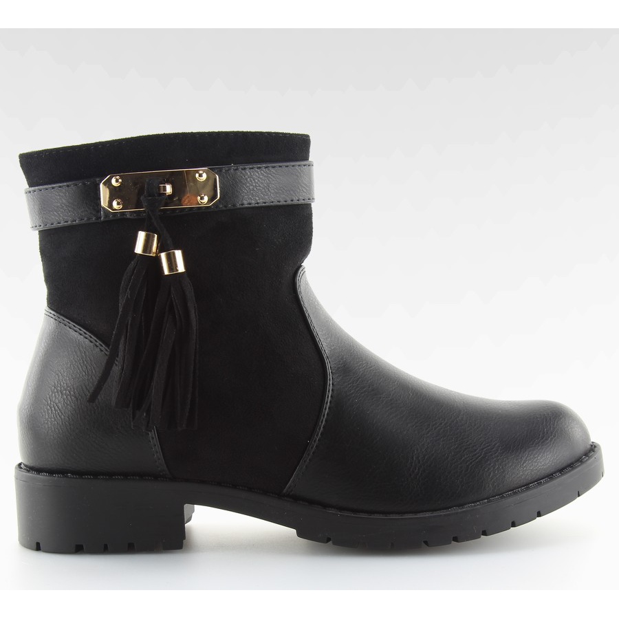 Vi presenterar eleganta svarta ankelstövlar för kvinnor Y8567 svart - ett perfekt val för övergångssäsongen! Dessa snygga skor kännetecknas av en vacker kombination av fullnarvt ekoläder och ekomocka, vilket ger dem en unik karaktär. Ett dekorativt bälte med gulddetaljer och fransar ger dem en sofistikerad look, perfekt för olika tillfällen.