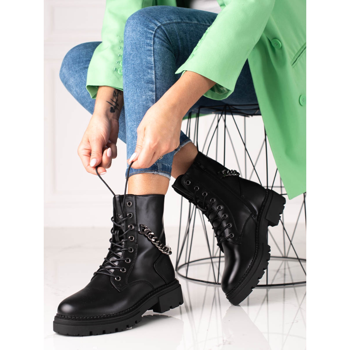 Upptäck stil och komfort med svarta arbetsstövlar för kvinnor med en kedja från Shelovet, som passar perfekt till trenderna för höst/vintersäsongen. Dessa fashionabla ankelboots på en tjock plattform är det perfekta valet för kvinnor som vill kombinera avslappnad och rockig stil i sin vardagsgarderob.