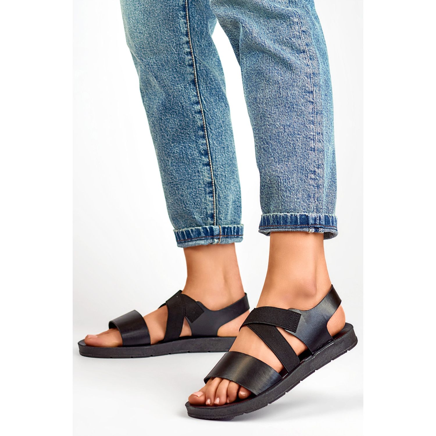 Detaljer: Svarta elastiska sandaler med en passande ovandel och resårband