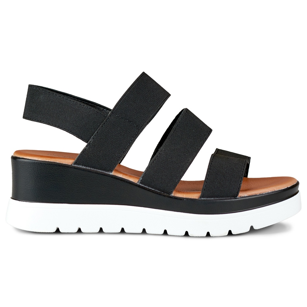Välj svarta elastiska sandaler på en låg plattform och njut av en moderiktig look och komfort i varje steg!