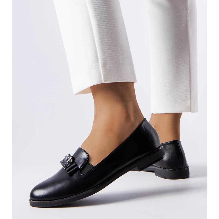 Klassiska, slip -up loafers i en elegant, tidlös svart färg. En smidig ekologisk läder övre dekorerad med en subtil båge med zirkoner lägger till stil utan att störa skornanas universella natur. En platt sula och en rundad näsa säkerställer komfort dagligen, och en smal linje kommer att fungera särskilt på smalare fötter.