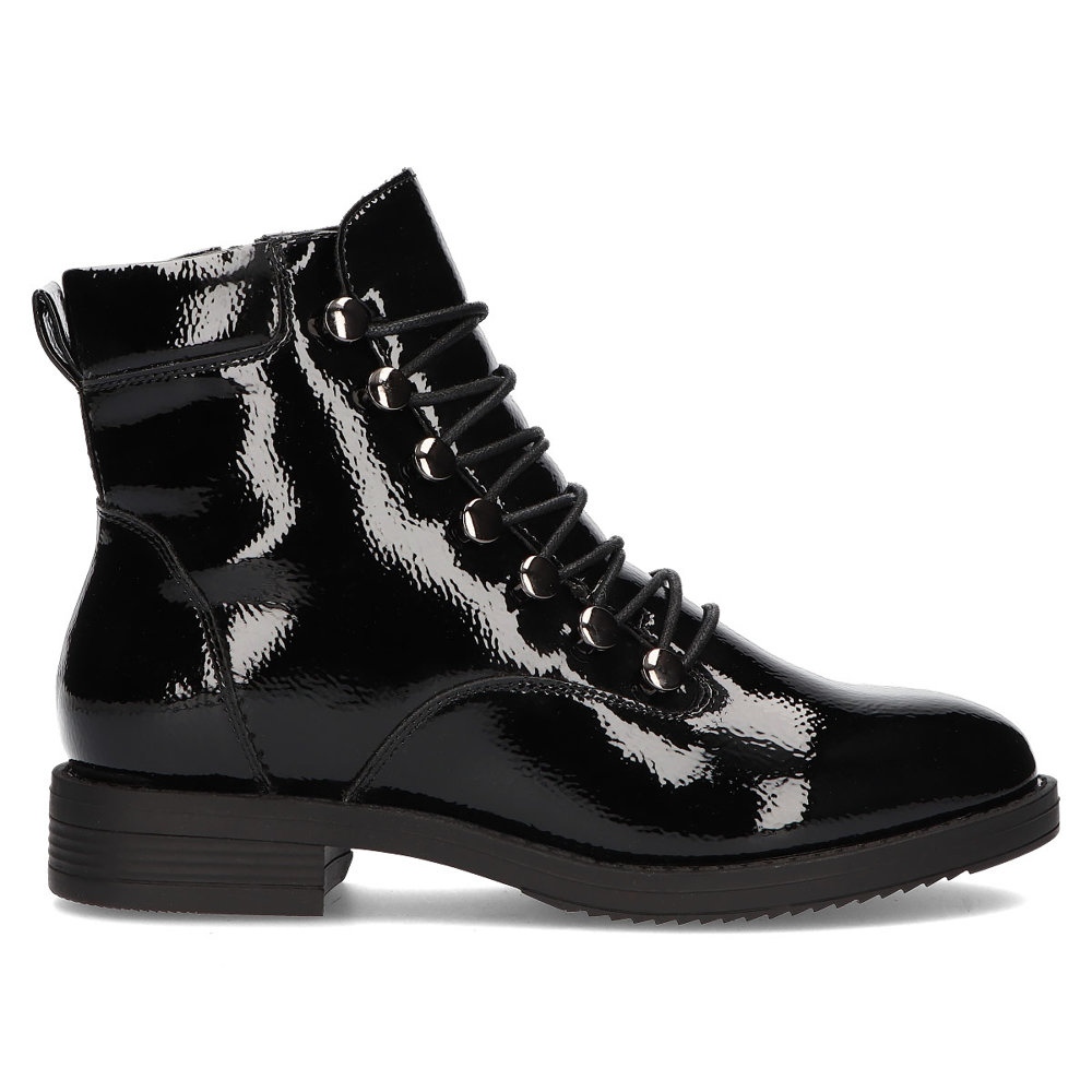 Dragkedjan och snörningsdetaljerna är praktiska element som gör att du enkelt kan anpassa stövlarna efter dina behov. Den lackade finishen ger dem en elegant stil, och den tidlösa svarta färgen passar både avslappnade och mer formella stilar.