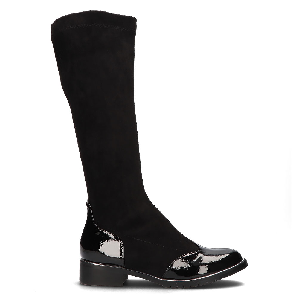 Dessa svarta stövlar är perfekta för vardagsstyling. Knähög och rund näsa gör att de ser klassiska och universella ut. Tack vare slip-on-fästet går det snabbt och bekvämt att sätta på och ta av dem. Plastsulan säkerställer tillräckligt grepp och hållbarhet, och plattformshöjden på 1 cm ger subtil komfort.