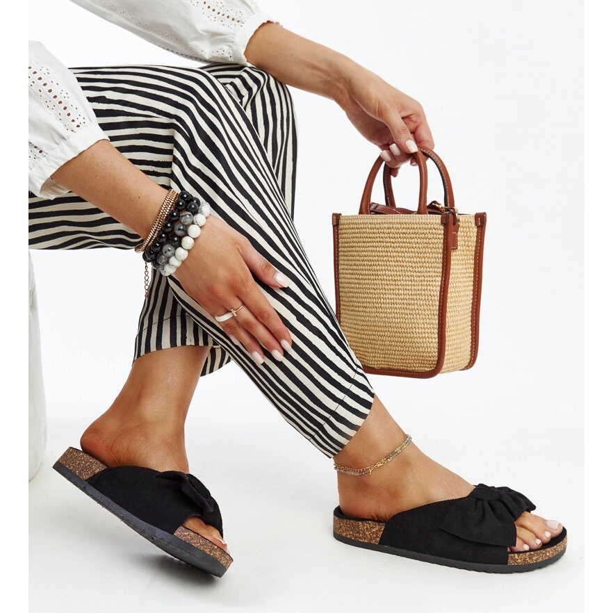 DF858-modellen kännetecknas av en elegant rosett som tillför feminin charm till den. Den runda tån och avsaknaden av hög klack gör flip-flopsna praktiska och bekväma, perfekta för både vardagsresor och sommarmöten med vänner. Tillverkade av ekologiskt mockaskinn ser de stiliga ut i klassisk svart, som enkelt matchar vilken sommarstyling som helst.