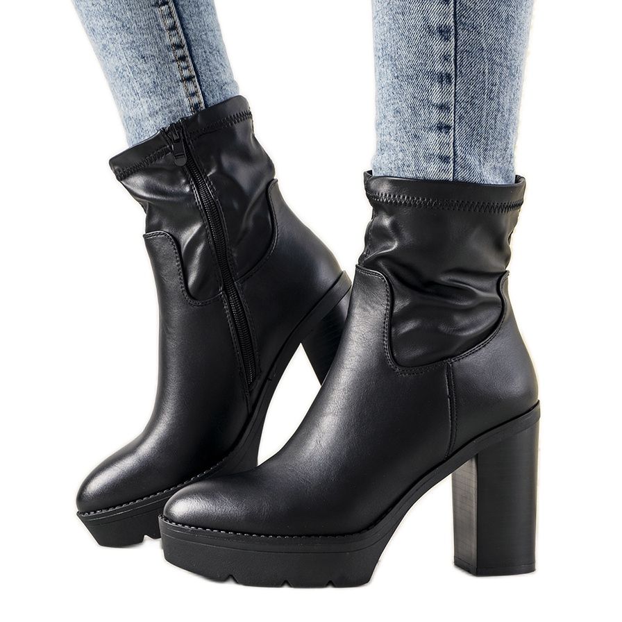 Svarta högklackade ankelboots av elastiskt kvalitetstyg är ett perfekt val för våren och varma höstdagar! Dessa eleganta skor, gjorda av ekologiskt läder, kombinerar stil och komfort. Det flexibla materialet gör att den passar perfekt till fötterna, och den höga hälen på 11 cm kommer vackert att framhäva linjen på benen och göra dem smalare.