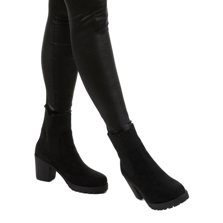De svarta stövlarna kännetecknas av en elastisk strumpa i tyg som gör dem lätta att ta på och anpassar sig efter benet, vilket säkerställer perfekt stöd och komfort. Ankelhöjden tillför feminin charm, och den solida blockhälen, 7,5 cm hög, garanterar stabilitet och komfort när du går.