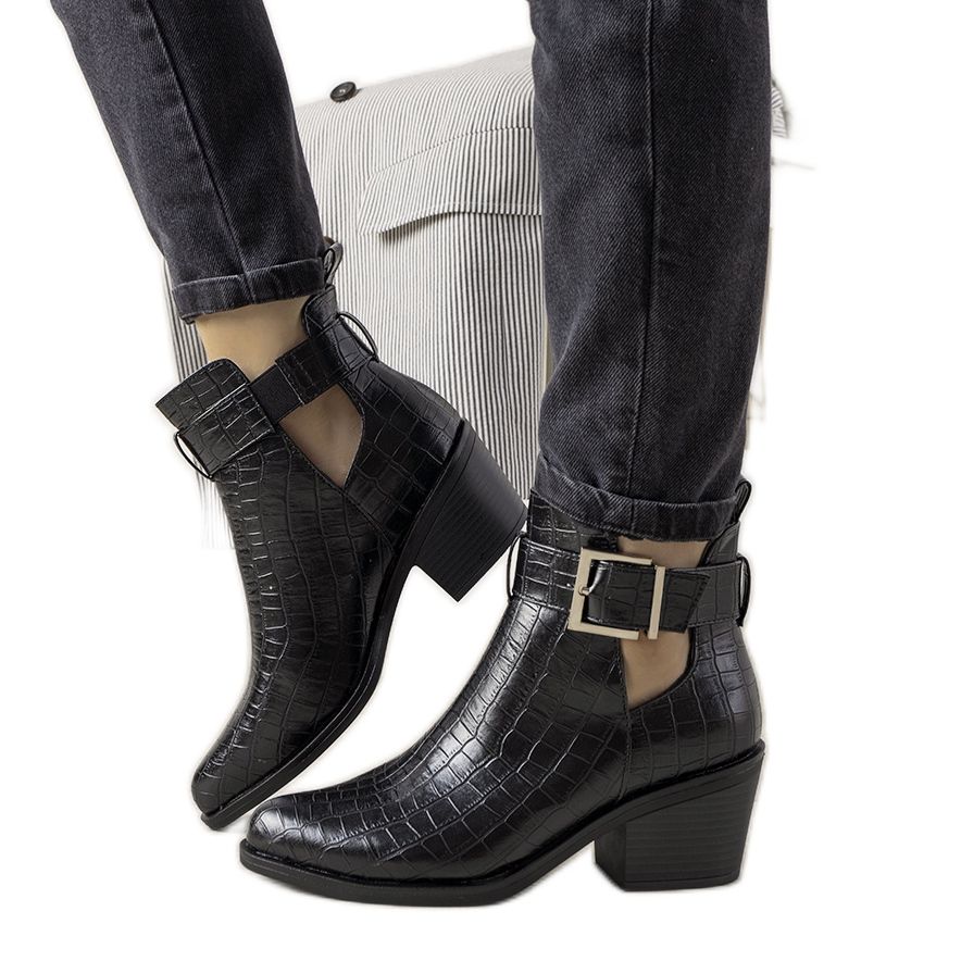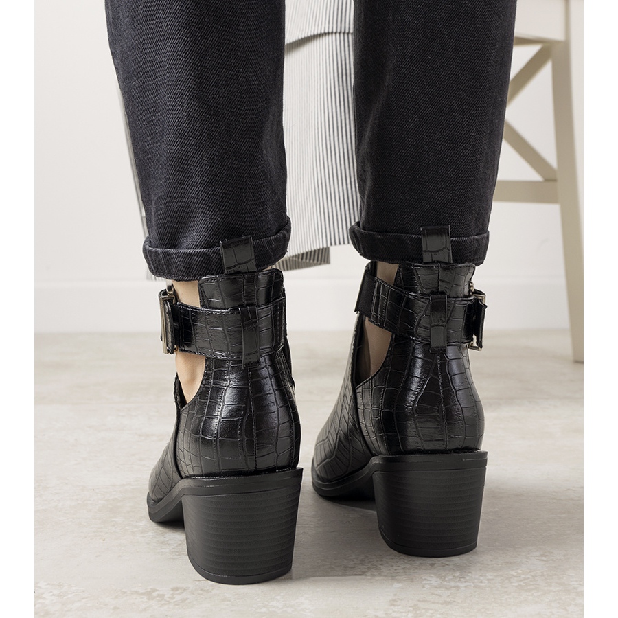 Moderniso svarta högklackade ankelboots med utskärningar är det perfekta valet för kvinnor som vill kombinera elegans med komfort. Denna modell imponerar med ett unikt mönster som imiterar krokodilskinn, vilket ger den karaktär och unik stil. Tack vare den praktiska slip-on och den justerbara remmen runt fotleden är passformen till foten extremt bekväm.