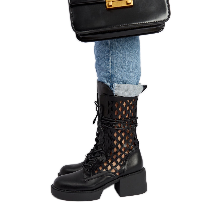 Svarta Visalia högklackade öppna stövlar är ett idealiskt val för kvinnor som vill kombinera elegans med komfort. Det distinkta genombrutna mönstret ger skorna en unik karaktär, vilket möjliggör ett effektivt spel av ljus och skugga på foten. Denna modell har designats med praktiska tankar - tack vare dragkedjan blir det extremt enkelt och snabbt att ta av och på skorna.