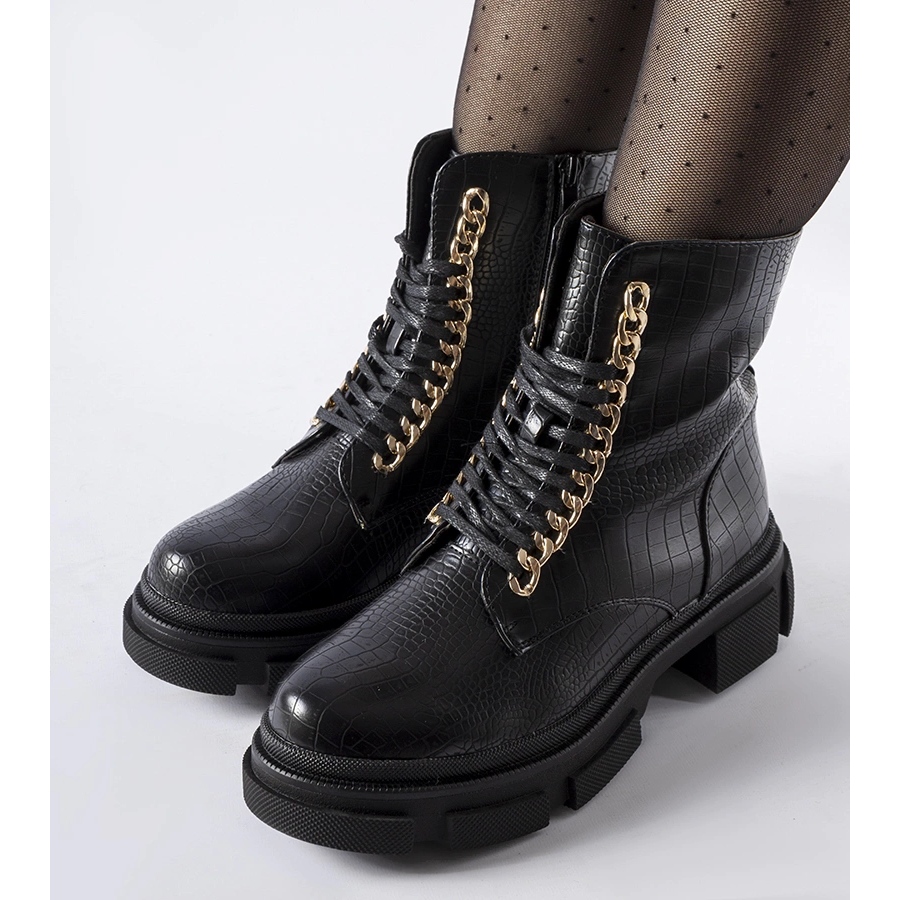 Svarta arbetare med Goodland Decorative Chain - Modern, bekväm och full av karaktär. Denna modell kombinerar stadsstil med praktiska lösningar: den räcker till vristen, har en platt, stabil häl och en effektiv kedja som ger hela fashionabla, råa uttrycket. Perfekt för tillfälliga säsonger - höst och vår.