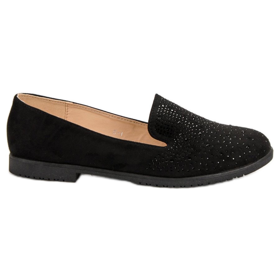 Black Lords With Crystals är ett förslag som njuter av sin kombination av stil och komfort. Dessa unika skor, gjorda av ekologiskt mockaläder, kommer säkerligen att dra till sig uppmärksamhet tack vare subtila svarta kristaller placerade på framsidan. Perfekt för vardagsbruk, de är ett utmärkt alternativ till traditionella balettlägenheter, samtidigt som de erbjuder ett modernt och unikt utseende.