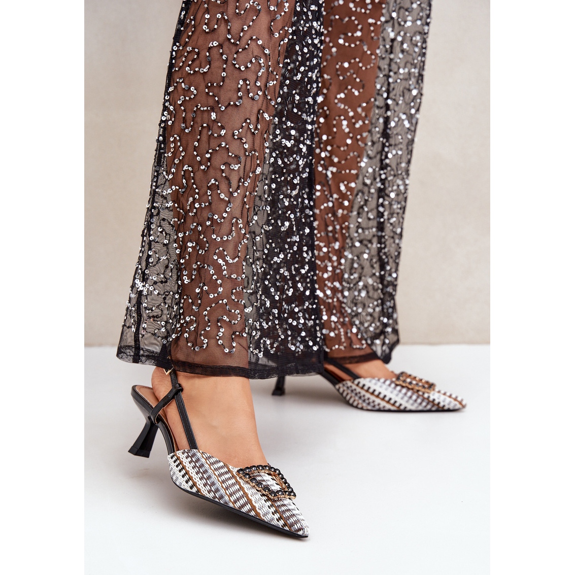 Detaljer: Svarta höga klackar med dekoration och öppen klack