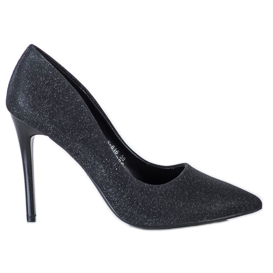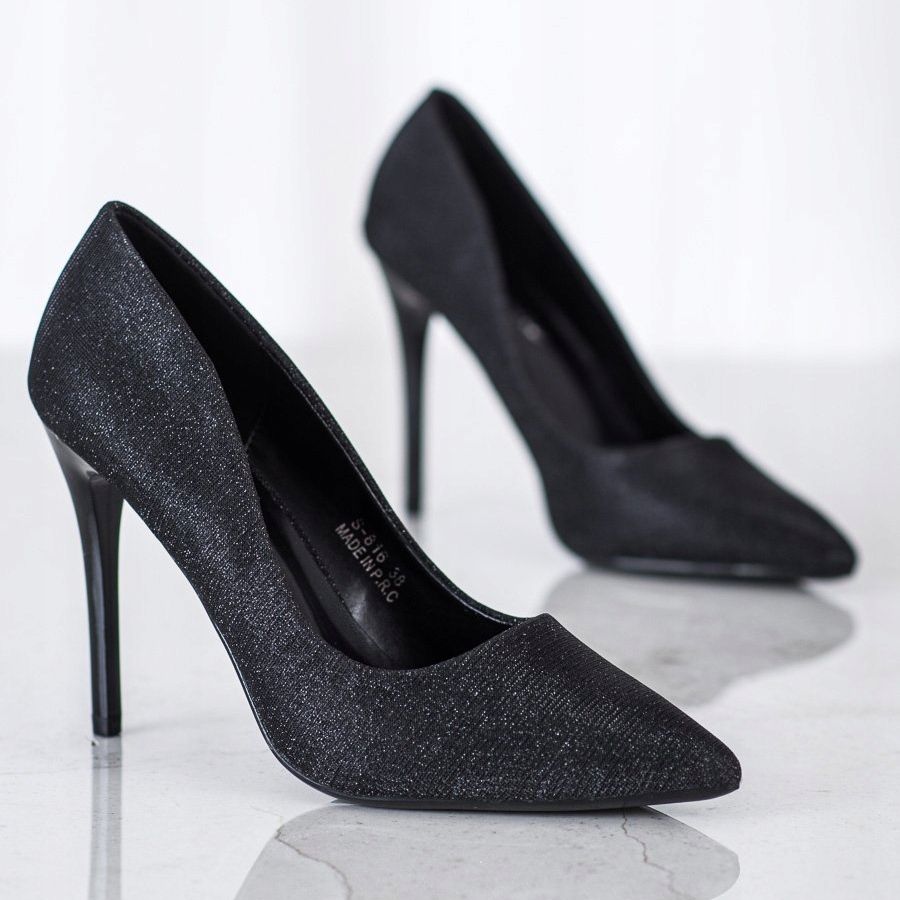 Svarta höga klackar med glitter har en spetsig tå, vilket är karakteristiskt för de mest fashionabla stilarna i modevärlden. Praktiskheten säkerställs av att det är slip-on-modeller vilket gör det lättare att ta av och på skorna snabbt.