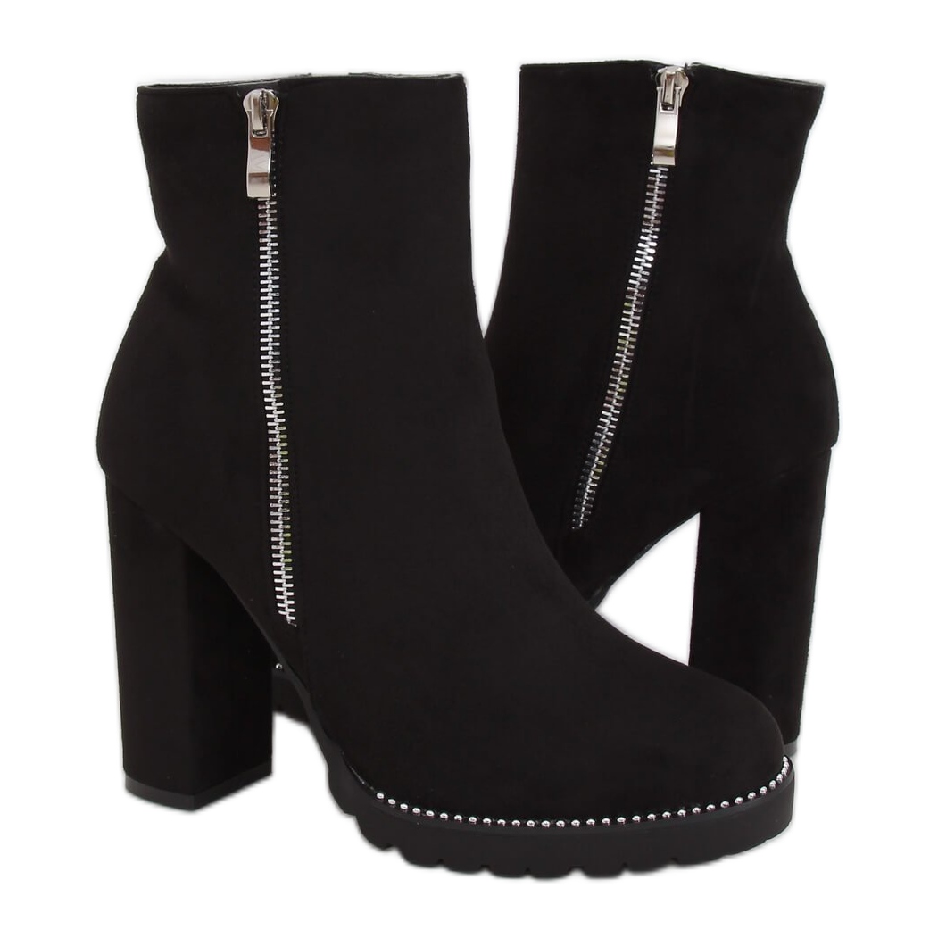 Upptäck elegans och komfort med svarta BM287 Svarta högklackade ankelboots! Dessa ankelstövlar för kvinnor gjorda av ekologisk mocka är det perfekta valet för varje kvinna som vill kombinera mode med komfort. Deras vackra design berikad med snygga tillbehör, som silverpärlor och en dekorativ dragkedja, ger dem en unik karaktär som gör att de sticker ut från mängden.