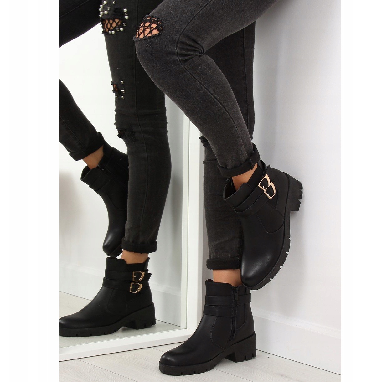 Stövlarna erbjuder stabilitet tack vare en bred 5 cm hög klack och 2 cm plattform, och garanterar komfort även när de bärs under långa perioder. En tjockare, fångad sula i kombination med klassisk svart gör dessa skor till ett perfekt komplement till många stilar. Dessutom ger guldspännen dem en lite rockig karaktär, vilket säkert kommer att tilltala älskare av uttrycksfull stil.
