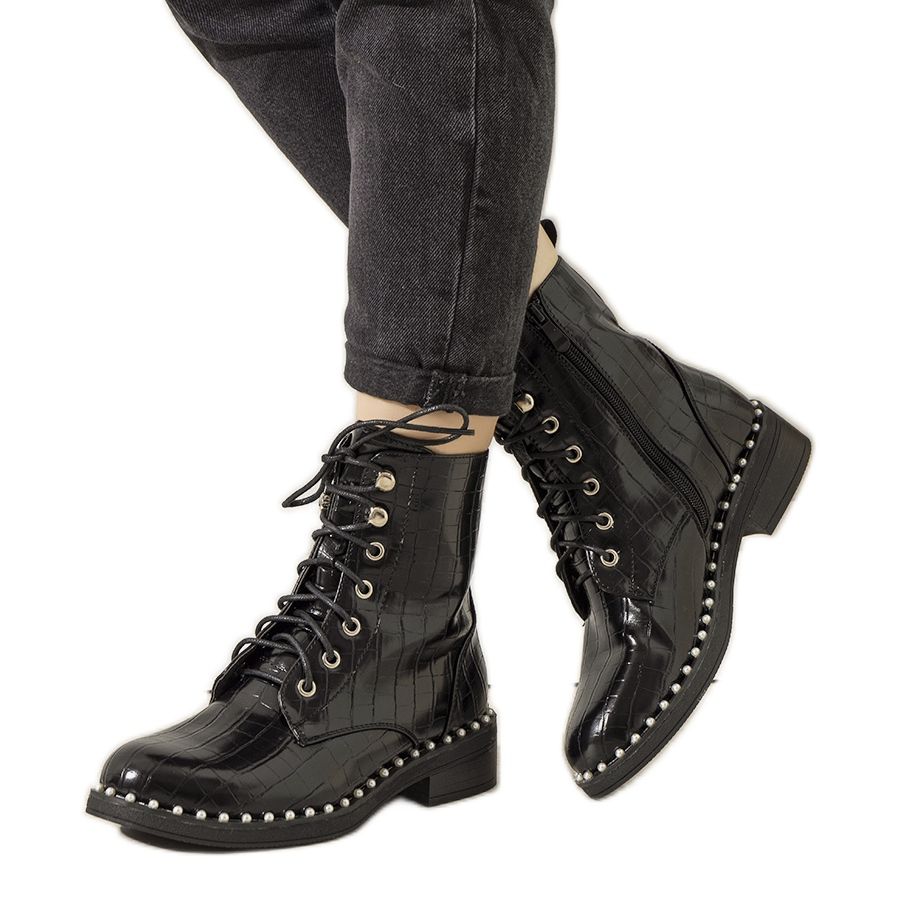 Upptäck elegans och komfort med svarta Nancy-isolerade ankelstövlar för kvinnor, som säkert kommer att bli ett favoritelement i din garderob. Dessa unika skor imponerar med sitt noggranna utförande, och ovandelen av ekologiskt läder med krokodilmotiv ger dem en stilren karaktär.