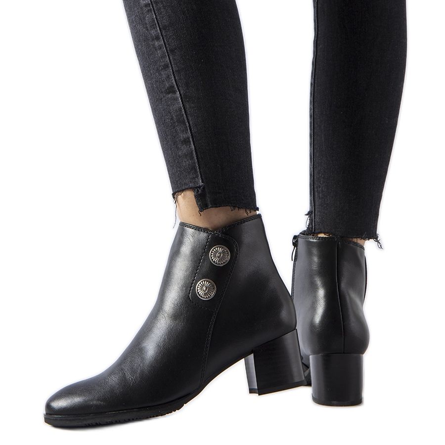 Eleganta, universella kvinnors stövlar idealiska för höstens säsong. Tillverkad av ekologiskt läder i en klassisk svart färg, inuti, mandel och en bekväm, låg stolpe.