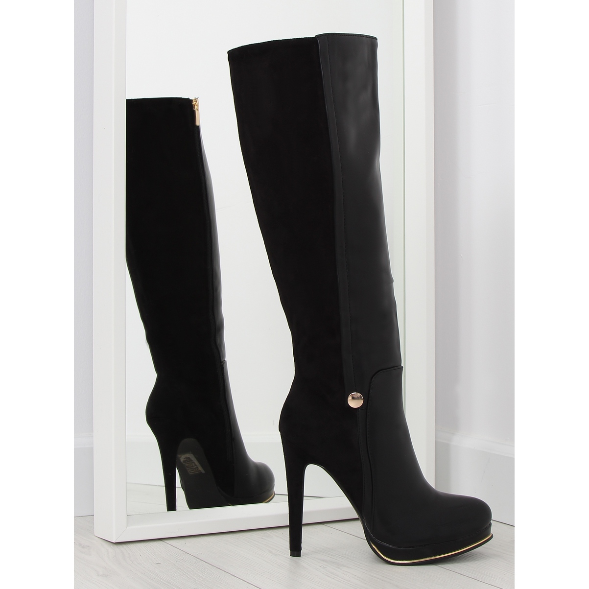 JU860 svarta plattformsstövlar är kvintessensen av elegans och modern stil. 11,5 cm höga, med en imponerande 2 cm hög plattform, de framhäver den kvinnliga figuren perfekt och ger självförtroende. Deras eleganta utseende beror på den noggrant färdiga sulan, dekorerad med snygga guldkanter, vilket skiljer dem från andra modeller.