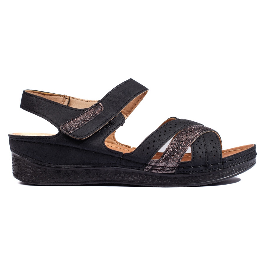 Finns i en klassisk svart färg, de matchar nästan alla styling, både avslappnade och mer formella. Det inre av sandaler från imitationen av huden kommer att säkerställa komfort under dagen. Sandaler levereras i tillverkarens ursprungliga förpackning, vilket också gör dem till en idealisk presentidé.