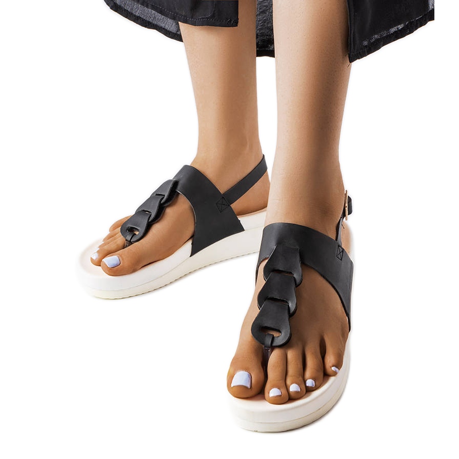 Eleganta kvinnors flip -flops på en stabil kil med en höjd av 4,5 cm. Den klassiska svarta av det övre tillverkningen av ekologiskt läder kombineras med en kontrasterande vit gummisula - ett effektivt och universellt utseende som matchar både vardagliga och eleganta sommarstyliseringar.