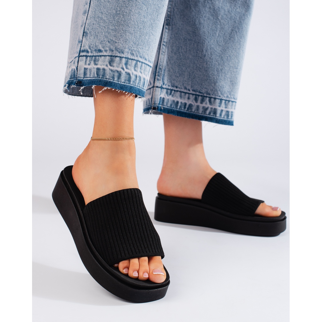 Tack vare den 5 cm höga kilen förlänger flip-flops optiskt figuren och garanterar samtidigt stabilitet och komfort under gång. En enkel, klassisk design i en universell svart färg gör att dessa flipflops passar perfekt in i den avslappnade stilen och matchar många sommarstilar - från vardagskläder till mer eleganta kombinationer.