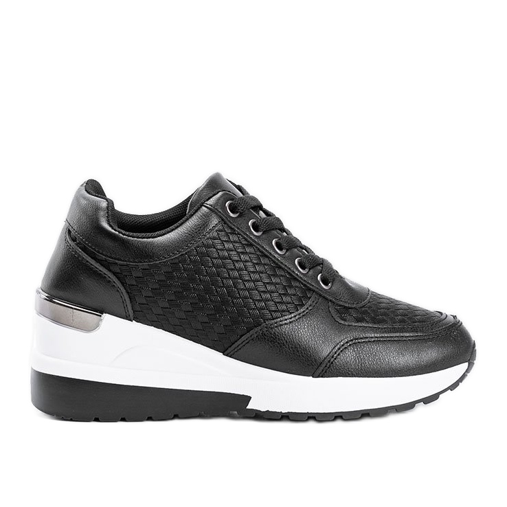 Ovandelen är gjord av ekologiskt läder, dekorerad med insatser som imiterar tjock fläta, vilket ger dem originalitet. En intressant accent är den vita sulan, som kontrasterar med det svarta på skorna, vilket ger dem lätthet och en sportig karaktär. En 6,5 cm hög kil säkerställer stabilitet och bärkomfort, medan den totala höjden på skorna är 13 cm.