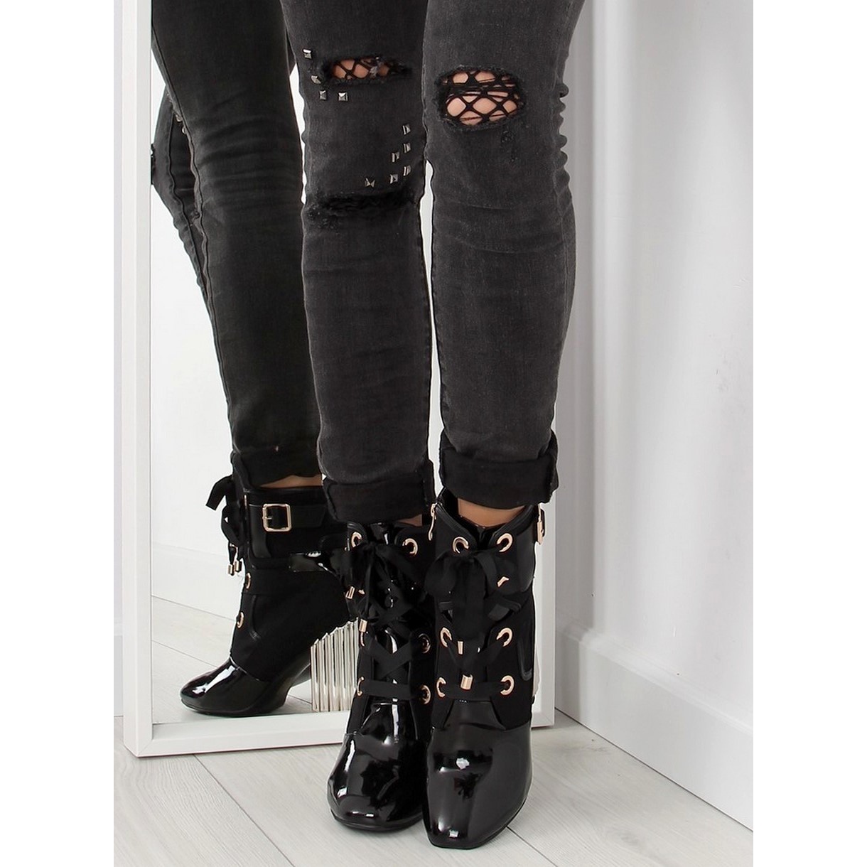 Dessa stövlar är gjorda av lack och tyg med canvasstruktur och ser verkligen imponerande ut. Den ursprungliga 10 cm höga hälen ger klass och låter dig känna dig säker i alla situationer. Snörningsdesignen har berikats med en praktisk dragkedja, vilket gör att sätta på dem till ett rent nöje.