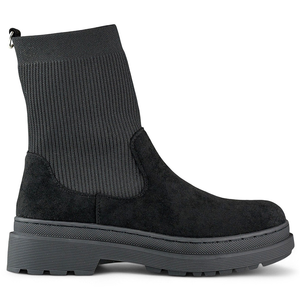 Upptäck elegans och komfort i ett tack vare de svarta klassiska stövlarna med en socka från ett annat märke. Dessa snygga kvinnors skor är ett perfekt komplement till varje höst- och vinterstyling. Tillverkade av ekologisk mocka av hög kvalitet kännetecknas av en modern, minimalistisk design som aldrig går ut ur modet.