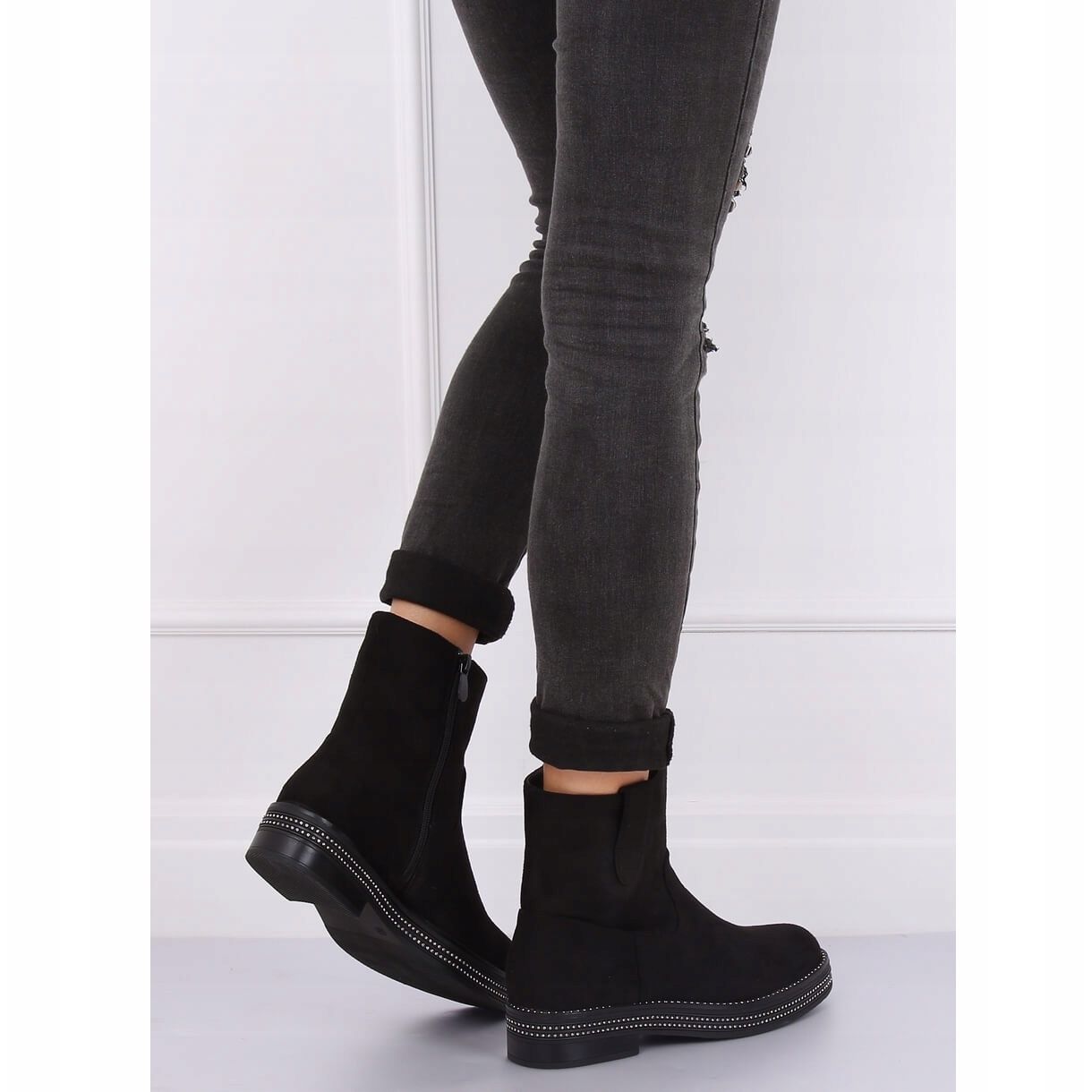 Vi presenterar platta stövlar för kvinnor i en klassisk svart färg, modell CH1812-2 Svart. Dessa unika ankelstövlar i mocka kombinerar elegans med moderna accenter, förtjusande med subtila strass placerade på den höga sulan. Hälhöjden på 4,0 cm och den runda tån gör dem extremt bekväma, perfekta för vardagsbruk.