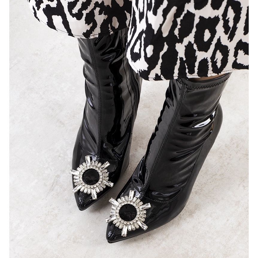 Fenomenala stövlar som omedelbart lägger till din stilisering till stil och sexappell. Den lackerade övre delen av ekologiskt läder med hög kvalitet återspeglar vackert ljus, och en smal näsa i en spitz och 10,5 cm hög stift förlänger benen. Mild zirkondekoration lägger till elegans och subtil glöd - perfekt för kvällsutflykter och eleganta tillfällen.