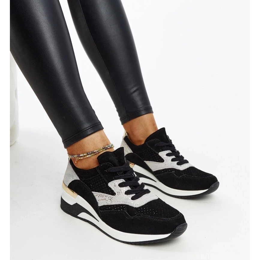 Kilhöjden 11,5 cm möjliggör bekväm att höja figuren, även om den inte ger upp komforten med sportskor. Manfrin -sneakers finns i en elegant svart färg som går perfekt med olika stiliseringar.