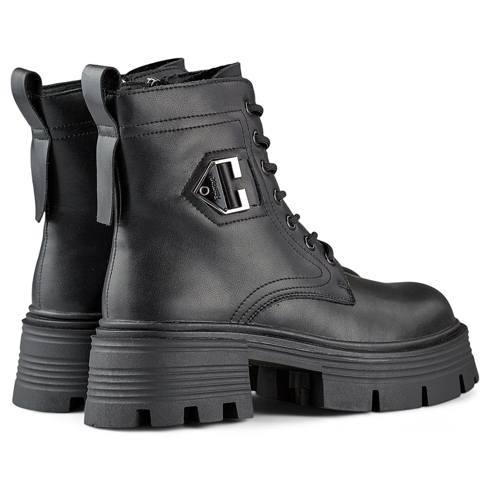 Rå, klassiska svarta stövlar med en rundad näsa är en del av de senaste modetrenderna och förblir samtidigt extremt mångsidiga och matchar många stilar. Höjden på den övre av 15 cm och en 6 cm hög plattform ger säkerhet vid varje steg och subtilt förlänger benen. Kast av blixtlås och ytterligare snörning gör att stövlarna perfekt anpassar sig till foten, och du får full rörelsefrihet.