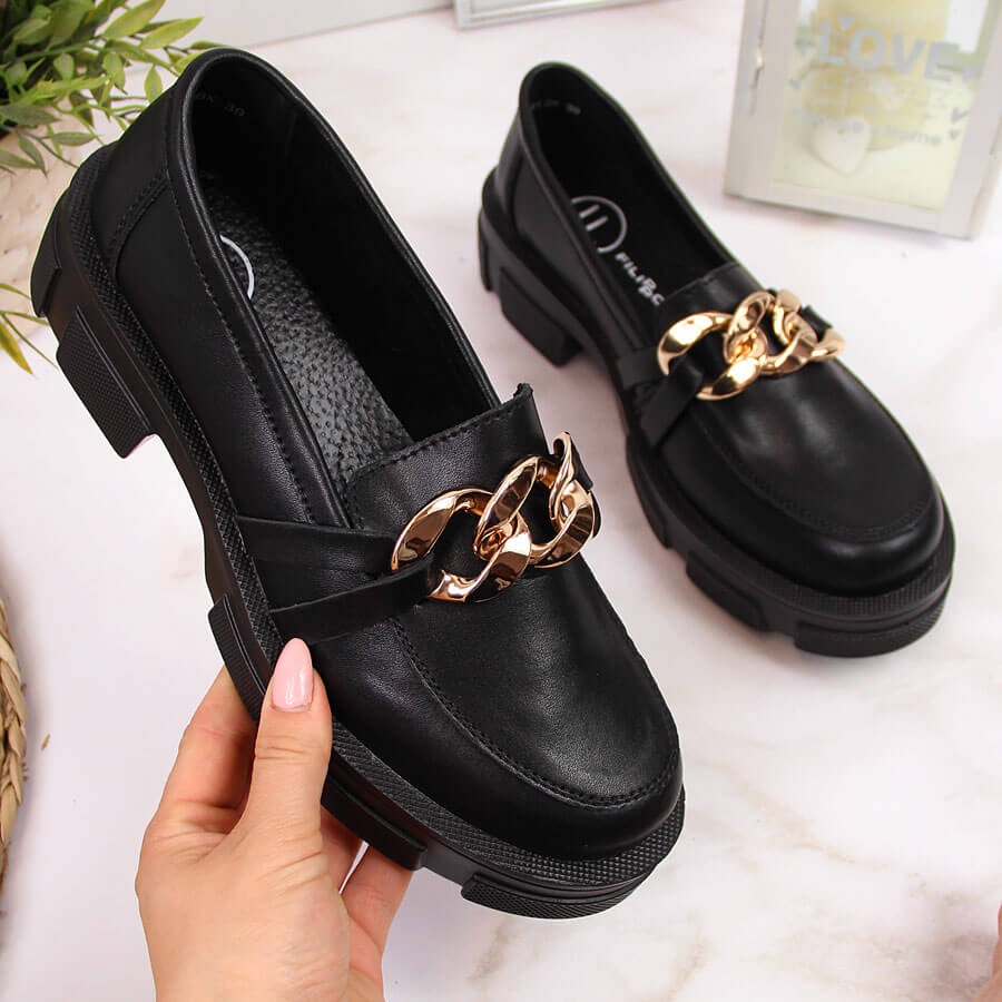 Upptäck extremt moderiktiga läderskor för kvinnor med en kedja i svart från det välkända märket Filippo. Dessa extremt snygga skor är det perfekta komplementet till alla kvinnors styling, och kombinerar elegans med extraordinär komfort. Den dekorativa kedjan som dekorerar denna modell ger den en unik glans, vilket gör att även de enklaste outfits får en unik karaktär.