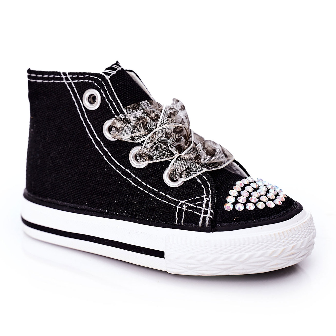 Klassiska, svarta barnsneakers dekorerade med subtila zirkoner - perfekt dagligen och för speciella tillfällen. Tillverkade av hållbart tyg som är resistent mot smuts, kombinerar de en fashionabla look med praktiska lösningar.