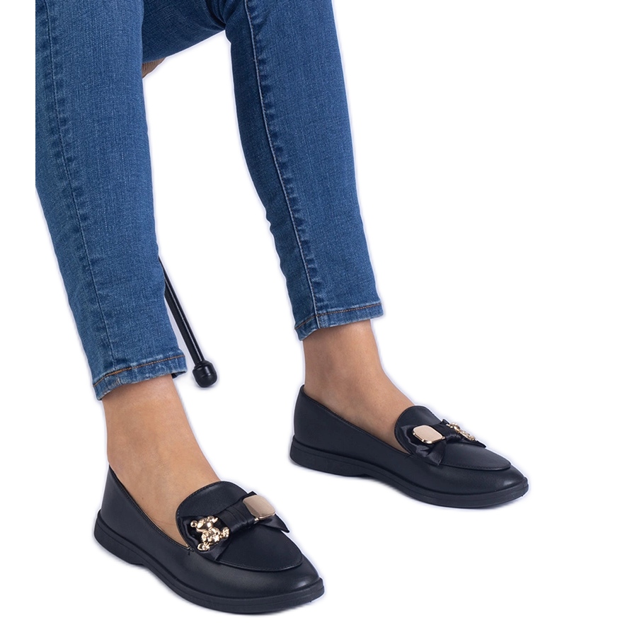 Detaljer: Svarta loafers dekorerade med en båge och en gyllene nallebjörn