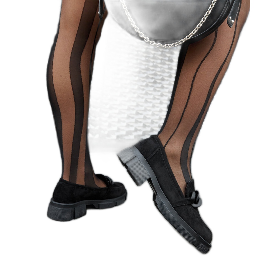 Svarta loafers med en kedja av ekomocka är ett perfekt val för moderna kvinnor som vill kombinera komfort med elegans. Tillverkade av ekologisk mocka, dessa snygga skor ser extremt imponerande ut, och deras klassiska svarta färg gör att de matchar många sommarstilar. Dekorerad med en subtil kedja, GD-XR-119C-modellen väcker uppmärksamhet och ger karaktär till både vardagliga och mer formella outfits.